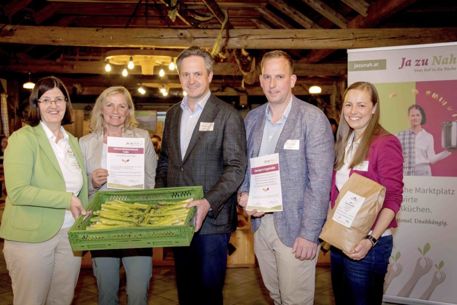Elfriede Schaffer, Geschäftsführerin von Ja-zu-nah, berichtete über den aktuellen Stand und zeigte einen Blick in die Zukunft. „Wir arbeiten mit den Ja-zu-nah Bäuerinnen und -Bauern und den Küchenleitern tagtäglich bestens zusammen. Bei Gesprächen mit potentiellen Kunden merken wir aber, dass viele Großküchen gerne regionale Lebensmittel einkaufen würden, aber nicht können, weil ihnen rechtlich und administrativ die Hände gebunden sind. Da haben wir noch ein ordentliches Stück Arbeit vor uns, um gemeinsam rechtliche Möglichkeiten für mehr Regionalität in den Küchen zu finden. Umso wichtiger ist es uns, das Vertrauen der bestehenden Partner weiter zu vertiefen und mittels einer Anerkennungsurkunde bringen wir diese Wertschätzung auch zum Ausdruck.“ Weitere Pläne für die Zukunft betreffen etwa die Abnahmesicherheiten erklärt Schaffer: „Ein weiteres Vorhaben ist es, den bäuerlichen Betrieben mittelfristig eine Abnahmesicherheit für deren Produkte zu garantieren, dazu benötigt es das Commitment der Großküchen, regelmäßig möglichst vorab definierte Mengen zu melden und auch abzunehmen. Das ist eines von vielen Zielen für die Zukunft, welches aber notwendig ist, um ein nachhaltiges Mengenwachstum zu erlangen.“ Gerade jetzt stehen wieder viele saisonale Produktneuheiten unmittelbar vor der Einführung in das Ja-zu-nah-Sortiment – von Erdbeeren, Spargel, Melanzani, Mangold bis hin zu Goldhirse, Linsen und Einkornreis. Dies ist für Küchen ein optimaler Zeitpunkt, sich von der tollen Produktqualität der Ja-zu-nah-Produkte zu überzeugen.