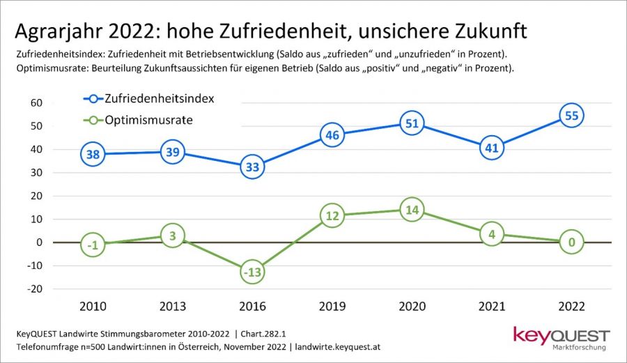 Österreichs Bauern und Bäuerinnen können auf ein erfolgreiches Jahr 2022 zurückblicken und sind größtenteils mit der Entwicklung ihrer Betriebe zufrieden. Ursache dafür sind vor allem attraktivere Produktpreise, aber auch die gestiegene Wertschätzung der Gesellschaft. Der Ausblick aufs nächste Jahr ist allerdings nicht so positiv. Hier zeigt sich eine deutliche Unsicherheit, die vor allem durch die aktuellen Krisen hervorgerufen wird. Zu diesem Ergebnis kommt eine aktuelle KeyQUEST-Umfrage zur Stimmung unter Österreichs Landwirten.
