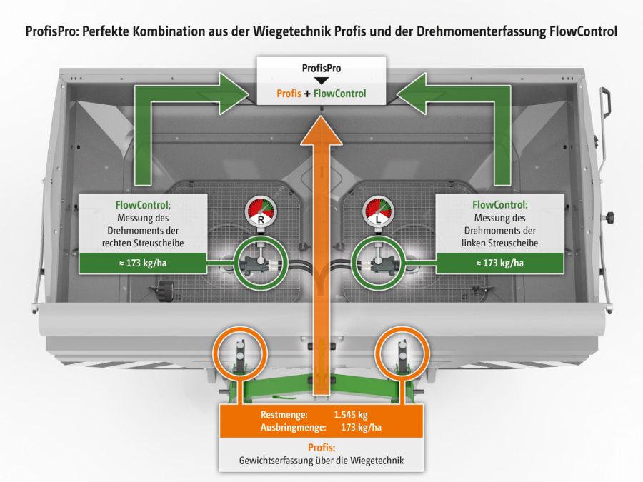Mit ProfisPro bietet Amazone ein neues intelligentes Wiegesystem für die Düngerstreuer-Baureihen ZA-TS und ZG-TS 01 an. ProfisPro umfasst die Interaktion der Wiegetechnik mit der neuen Drehmomentmessung FlowControl. Dank dieser Kombination regelt der Düngerstreuer während des gesamten Streuvorgangs über Drehmomente seine theoretische Ausbringmenge.
