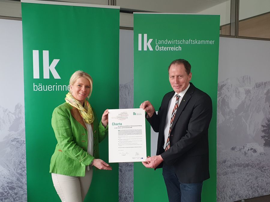 „Es ist wichtig und bereichernd, wenn sich die Vielfalt unserer heimischen Landwirtschaft auch in der Interessenvertretung widerspiegelt. Dazu zählt eine Ausgewogenheit zwischen Regionen und Betriebszweigen genauso wie zwischen Jung und Alt, Frauen und Männern. Die Partnerschaftlichkeit, die auf unseren Höfen gelebt wird, soll sich auch in den Organisationen und Gremien wiederfinden. Ich bin überzeugt, dass alle davon profitieren. Von daher unterstütze ich die ‚Charta für eine partnerschaftliche Interessenvertretung‘“, betont der Präsident der LKÖ, Josef Moosbrugger, der die Charta nun auch mit der neuen Bundesbäuerin unterzeichnet hat, um seine Unterstützung für die ARGE Bäuerinnen nochmals zu untermauern.