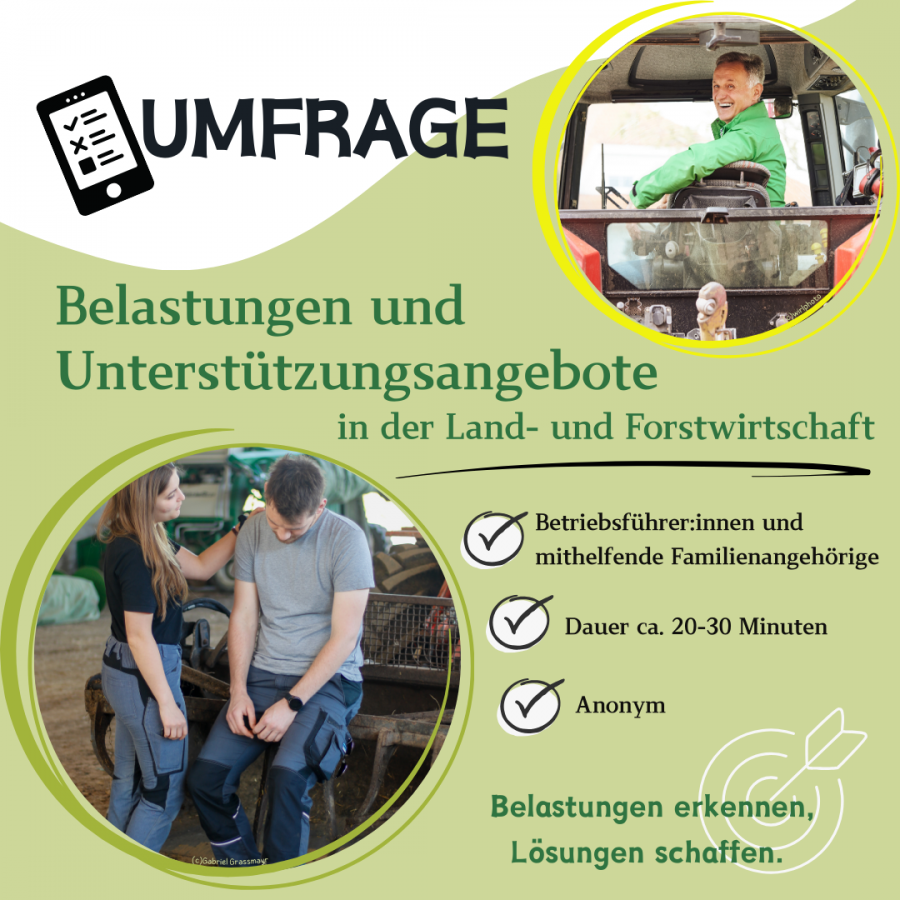Die Umfrage richtet sich an Betriebsführer:innen sowie mithelfende Angehörige in der Land- und Forstwirtschaft und bietet die Möglichkeit, wertvolle Einblicke zu geben und Veränderungsvorschläge einzubringen. Die Beantwortung der Fragen dauert etwa 20 bis 30 Minuten und ist vollständig anonym. Die Teilnahme ist ab sofort bis Ende Februar 2025 möglich.