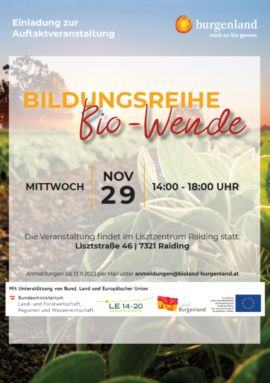 Mit der Auftaktveranstaltung am 29.11.2023 startet die Biogenossenschaft Burgenland eGen die Bildungsreihe Bio-Wende, um Betriebe bei der Umstellung auf Bio zu unterstützen. Mit diesem Bildungsangebot will man Küchenverantwortliche in der Gemeinschaftsverpflegung unterstützen, offene Fragen beantworten und Sorgen und Ängste bei der Umstellung auf Bio nehmen.