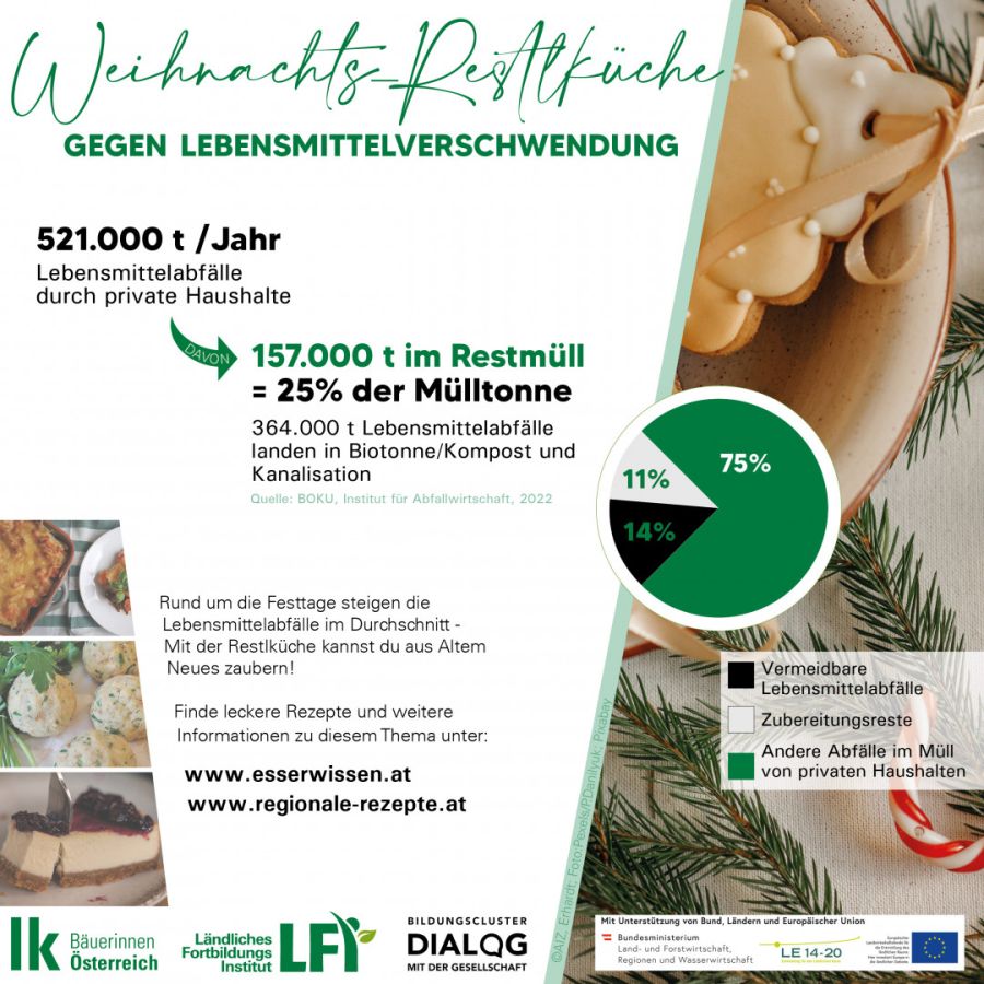 Der Blick in die Keksdose und den Kühlschrank spricht Bände. Da haben wir über die Festtage geschlemmt und doch sind noch der halbe Truthahn oder fast zwei Kilo Lebkuchen übrig geblieben. Was tun mit den Resten, um nicht nochmals das Gleiche auf den Tisch zu bringen? Zum Entsorgen viel zu schade, waren die Zutaten für das Weihnachtsmenü heuer doch viel teurer als noch im Vorjahr. Außerdem heißt es vom  Institut für Abfallwirtschaft der  BOKU Wien, die Haushalte seien mit knapp 521.000 t genießbarer Nahrungsmittel im Biokübel die größten Lebensmittelverschwender überhaupt. Wer öfter kocht, hat Übung darin, aus Resten interessante, pfiffige Mahlzeiten zuzubereiten. Hilfe geben dabei die heimischen Bäuerinnen.