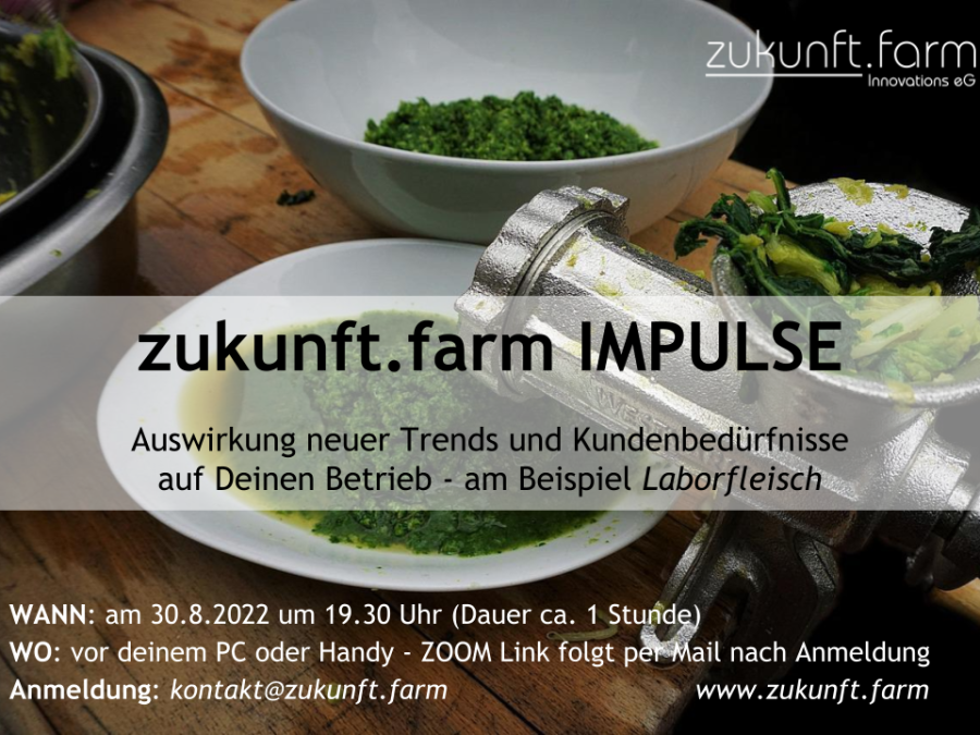 Genau damit beschäftigen wir uns in der aktuellen Ausgabe der zukunft.farm Impulse unserem kompakten Online Format für alle, die nicht nur AUF ihren Betrieben sondern auch AN ihren Betrieben arbeiten wollen. Anhand der aktuellen Entwicklungen von „Laborfleisch“ werden wir sehen, wie Technologien und Trends im Allgemeinen zu bewerten sind und welche Treiber dahinter stehen.
