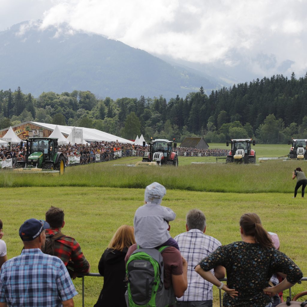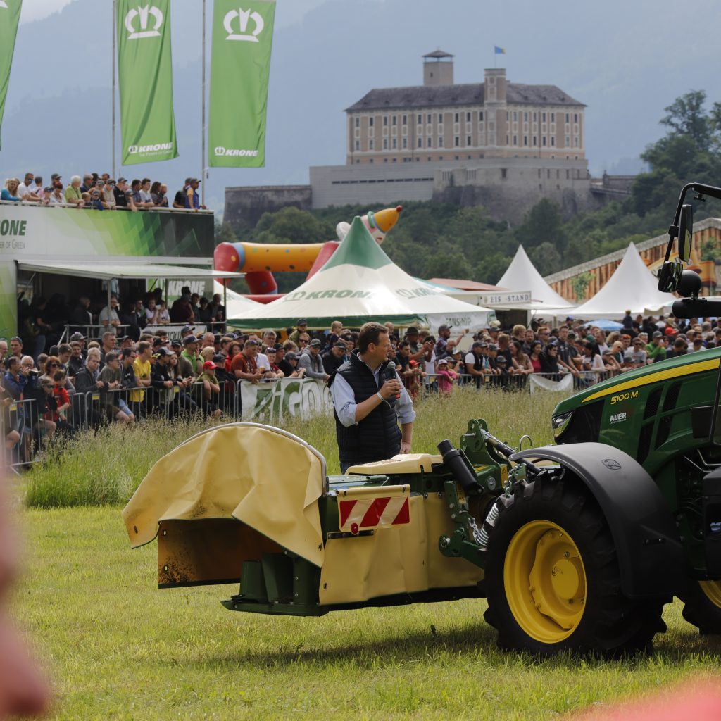 Am Vatertag war es wieder soweit, der „Krone BiG Day“ ging in die nächste Runde. Am Fuße des Grimmings organisierte der Landmaschinenhersteller zum vierten Mal den „ultimativen Grünlandtag“. Bei bestem Wetter und top Stimmung präsentierte Krone mit 60 Gespannen sein gesamtes Produktprogramm und konnte damit über 6000 Besucher locken. Um 10.00 Uhr ging das Event mit den Mähwerken los. Die Besucher konnten Geräte in jeder Größenordnung bestaunen – angefangen beim Frontscheibenmähwerk Easy Cut F mit einer Arbeitsbreite von 2,8 m bis hin zum Hochleistungsmähaufbereiter BiG M war alles zu sehen. Weiter ging es mit den Kreiselzettwendern, hier war sicher der KWT 2000 C das absolute Highlight. Mit einer Arbeitsbreite von 20 Metern wurde hier „The Power of Green“ präsentiert. Geschwadert wurde mit dem Swadro 380 Highland bis hin zum 19 Meter Schwader Swadro 2000 und auch bei den Pressen konnten die Zuschauer das gesamte Produktprogramm bestaunen – die Festkammerpresse Bellima, die fest oder variable Fortima, die vollvariable VariPack und die Press-Wickel-Kombi Comprima. Die Großpackenpressen wurden von den Moderatoren im Detail erklärt und Dank der Drohnen- und Videoliveübertragung auf den LED-Wänden, könnte man jede Details mitverfolgen. Weiter ging es mit den Ladewägen AX, MX, RX, GX und TX und als Abschluss durfte dann noch der Feldhäcklser BiG X bestaunt werden.