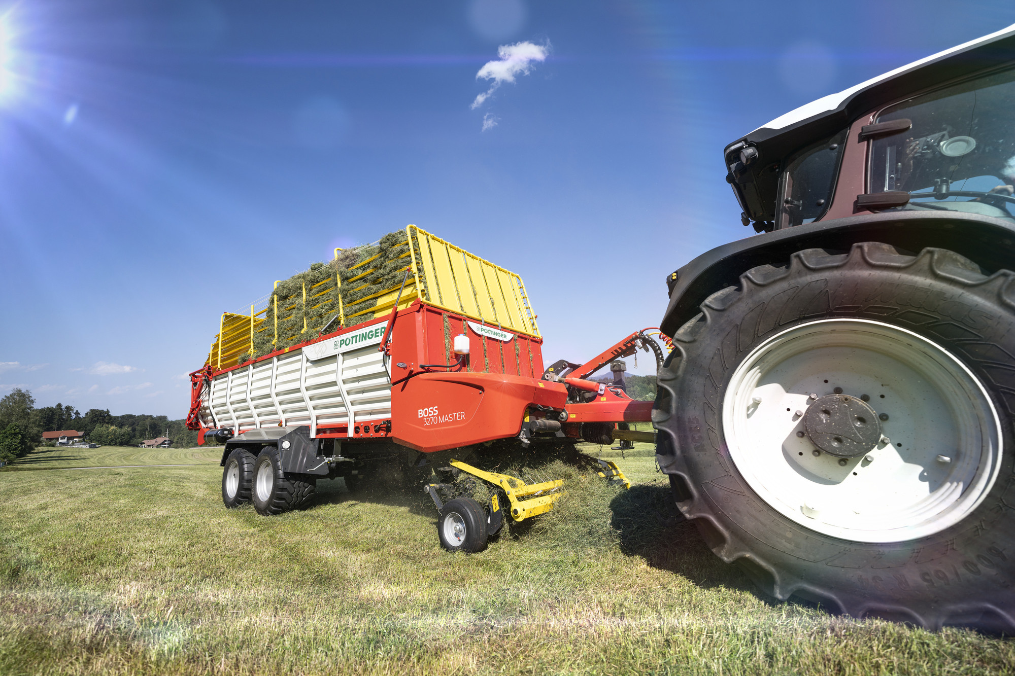 Der BOSS der Serie 3000 MASTER ergänzt das Produktprogramm der Ladewagen für kleinbäuerliche Strukturen und Betriebe im voralpinen Raum. Mit einem vollständig neuentwickelten Ladeaggregat ist es Pöttinger gelungen, gegenüber den klassischen Förderschwingen die Durchsatzleistung deutlich zu erhöhen und gleichzeitig den Wartungsbedarf zu minimieren.