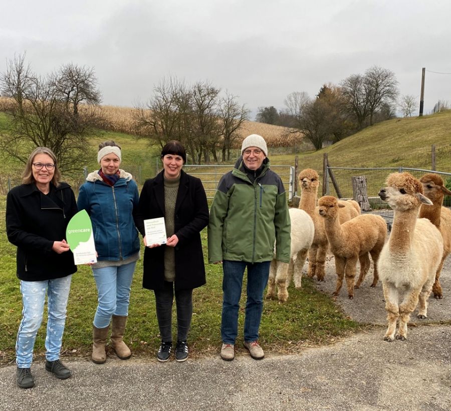 Nach Erfüllung aller erforderlichen Voraussetzungen bekam am 29. November Familie Swanton mit großer Freude die Green Care-Hoftafel überreicht. KDir. Ing. Robert Fitzthum, Vereinsobmann von Green Care Österreich, hob bei diesem Anlass „die breite Angebotsvielfalt der Green Care-Betriebe“ hervor. „So findet wirklich jede und jeder das Passende! Und wichtig: Selbstverständlich ist der Senninghof – wie auch unsere mittlerweile über 100 Green Care-Betriebe in ganz Österreich nach strengen Kriterien qualitätsgeprüft“, betont Fitzthum weiter. DI Elfriede Schaffer, Vorstandsmitglied von Green Care Österreich ist vom stimmigen Gesamtkonzept des neuen Green Care Betriebs überzeugt: „Am Senninghof passt alles zusammen: die wunderschöne Lage inmitten der Natur, das engagierte Team und ein wirklich gutes, hochwertiges Green Care-Programm für die Seele.“
