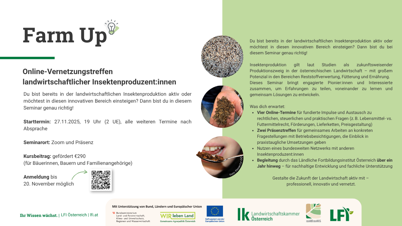 Das Ländliche Fortbildungsinstitut Österreich lädt zum innovativen Vernetzungsformat „Farm Up“ ein – einem österreichweiten Austausch für aktive und angehende landwirtschaftliche Insektenproduzent:innen.