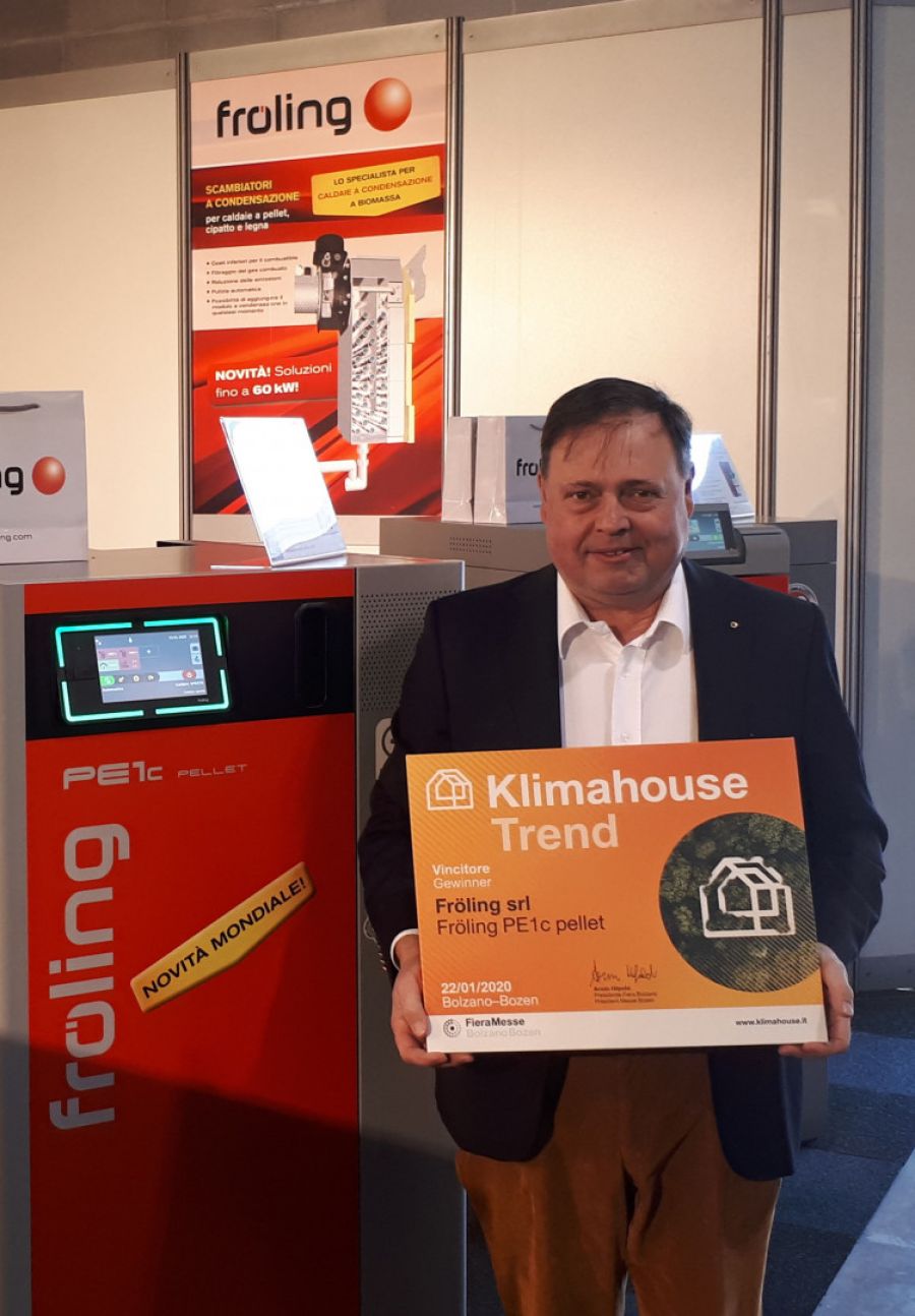 Das Interesse am Messestand des Heizkesselherstellers Fröling in Bozen war überwältigend. Komfortables Heizen mit Holz und Pellets steht hoch im Kurs, nicht zuletzt weil CO2-neutrales Heizen das Klima schont. Biomasse-Pionier Fröling hat hier die Lösungen mit der Technik der Zukunft – komfortabel, sauber und effizient. Dies wurde auch mit der Verleihung des Innovationspreises „Klimahouse Trend 2020“ für den Pellets-Brennwertkessel PE1c Pellet unterstrichen. Der PE1c Pellet mit integriertem Brennwertwärmetauscher kann zusätzlich mit einem Elektrofilter ausgestattet werden. „Diese beiden zukunftsweisenden Technologien kompakt in einem Gerät verbaut – das ist weltweit einzigartig am Markt“, freut sich Fröling-GF Dr. Ernst Hutterer. Die Jury, bestehend aus maßgeblichen Experten aus dem Bereich Energie-Gebäude-Umwelt, zeigten sich beeindruckt von diesem Produkt, welches perfekt zu den Anforderungen der aktuellen Zeit passt und auch schon die Anforderungen der Zukunft erfüllt.
