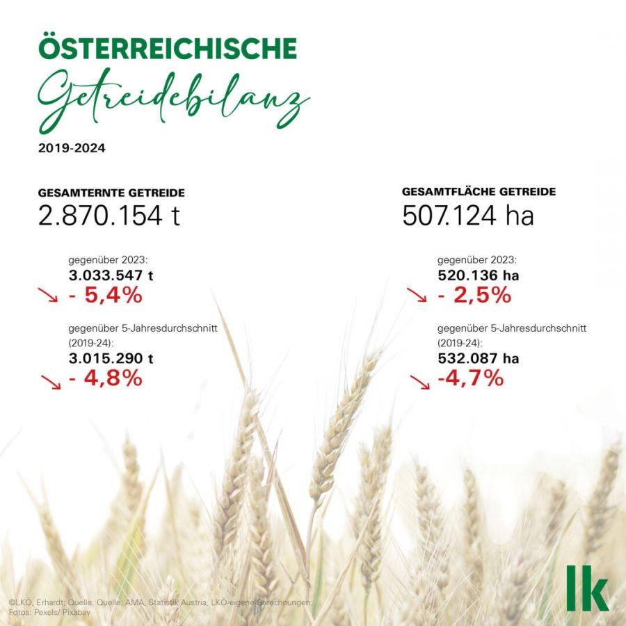 Derzeit wird mit einer geringeren, durchschnittlichen Getreideernte von knapp 2,87 Mio. t gerechnet. Das entspricht einem Minus von 5,4% gegenüber der Vorjahresmenge und einem Minus von 4,8% gegenüber dem Fünf-Jahresschnitt. Insbesondere die feuchten Anbaubedingungen im Herbst, aber auch unattraktive Marktpreise haben zu einer im Vergleich zu 2023 um 2,5% geringeren Getreideanbaufläche von 507.000 ha geführt. Während Getreide, Mais, Sonnenblumen und Raps zu den flächenmäßigen Verlierern zählen, wurden Zuckerrüben, Ölkürbisse und Erdäpfel wieder verstärkt angebaut.