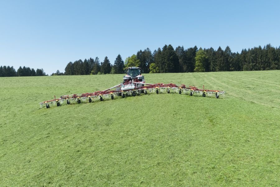 Das Herzstück ist, wie bei allen Zettern, der Dynatech Kreisel. Die vorderen Schutzbügel erhöhen als tragendes Element die Stabilität. Der Kreiseldurchmesser beträgt ideale 1,42 m. Die sechs geschwungenen Zinkenarme nehmen das Futter sauber auf und liefern durch den idealen Streuwinkel ein perfektes Streubild. Die nachlaufenden Arme „ziehen“ den Zinken und sorgen so für eine schonende Aufnahme. Die ungleich langen Zinkenschenkel nehmen das Futter gleichmäßig auf und verbessern so die Zettqualität.