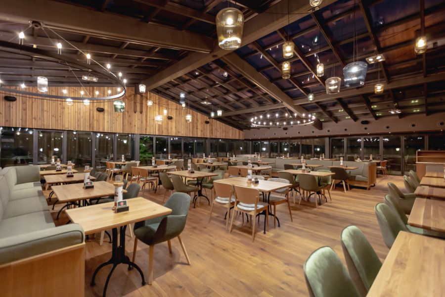 Natürliche Materialien und gedämpfte Farbtöne stellen eine angenehme Atmosphäre her. Eine Vielzahl an kleinen farbigen Glasleuchten kombiniert mit großen Lichtkreisen, die je nach Jahreszeit saisonal dekoriert werden können, erzeugen eine gesellige und gleichzeitig moderne Stimmung. Im Prater darf auch ein herrlicher Gastgarten nicht fehlen.