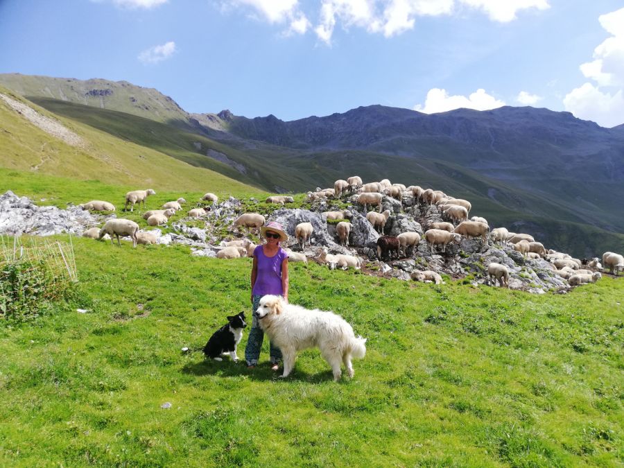 Einige Dutzend Kilometer weiter südlich bei Gaby Famos aus Ramosch im Kanton Graubünden ist die Situation (noch) etwas entspannter. Sie hat auf der Alp Rusena, auf der sie 440 Schafe hütet, noch keine Risse zu verzeichnen gehabt. „Wir hören aber, dass ein Wolf herumschleicht. In Wahrheit ist es also eine Frage der Zeit, bis er auch zu meiner Herde gelangen wird.“ Für alle Fälle will die Hirtin jedenfalls gerüstet sein: Denn neben den blökenden Gesellen verbringen auch Tyson und Flecki den Almsommer hoch oben in den Engadiner Bergen. Der Maremmen-Abruzzen-Schäferhund und der Französischen Pyrenäenberghund sind beeindruckende Gestalten und zeigen dem Gast recht anschaulich, wofür sie zuständig sind. Bei dem lauten Gebell und gelegentlichen Knurren wird schnell klar, dass man die Schafe besser in Ruhe zu lassen hat. „Sie merken sehr genau, wenn Gefahr droht“, erzählt Famos von jener Nacht, in der ein Bär durchgezogen ist und die Hunde unablässig aufgeregt drohend Runden um die Schafe gezogen sind. Meister Petz hat sich jedenfalls nicht in die Nähe der Herde gewagt.