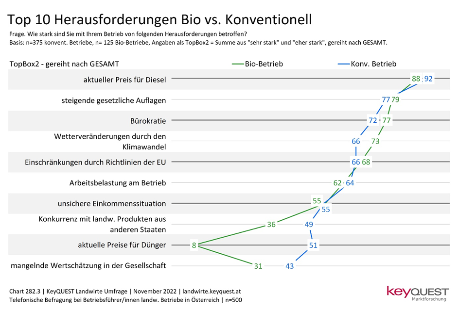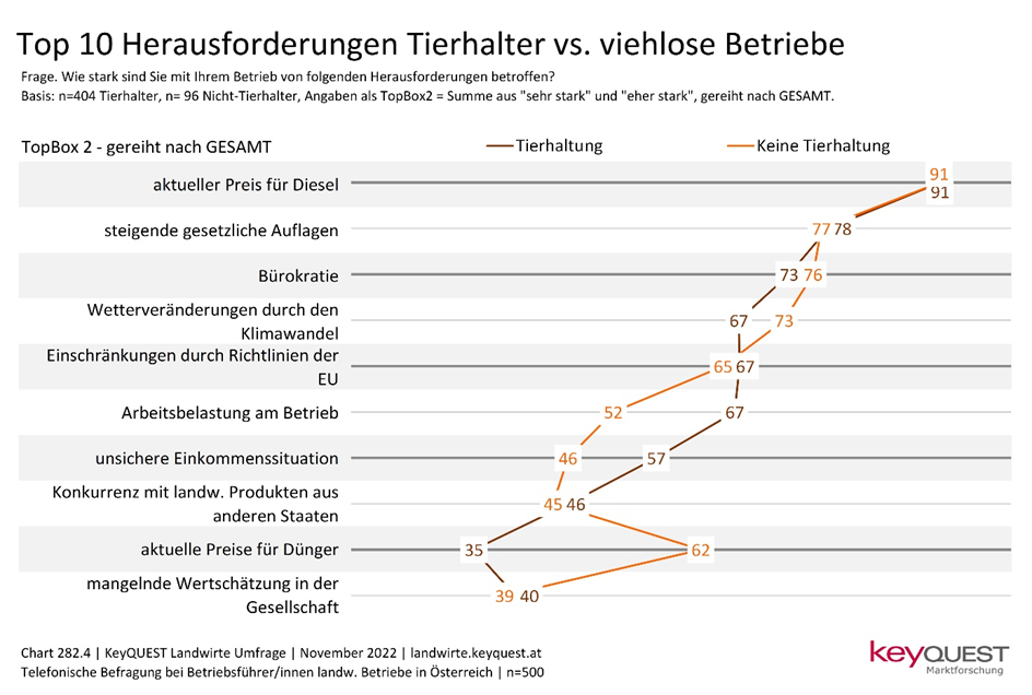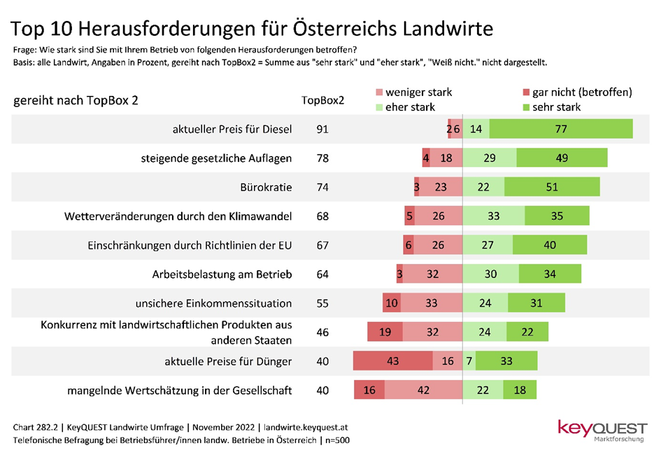 Auch wenn viele Produktpreise aktuell auf hohem Niveau liegen, bleiben Österreichs Bauern und Bäuerinnen auch 2023 gefordert. Denn die Landwirte sind mit zahlreichen Problemen konfrontiert, die größtenteils außerhalb ihres Einflussbereiches liegen. Neben den aktuellen Dieselpreisen sind es vor allem die Themen „steigende gesetzliche Auflagen und Bürokratie“ sowie „Wetterveränderung durch den Klimawandel“, die den Landwirten zu schaffen machen. Das ergab eine österreichweite KeyQUEST Studie unter 500 Landwirten. Erst weiter hinten im Ranking der Herausforderungen findet sich die Arbeitsbelastung am Betrieb, ein Faktor also, den man als Landwirt – zumindest teilweise – selbst in der Hand hat.