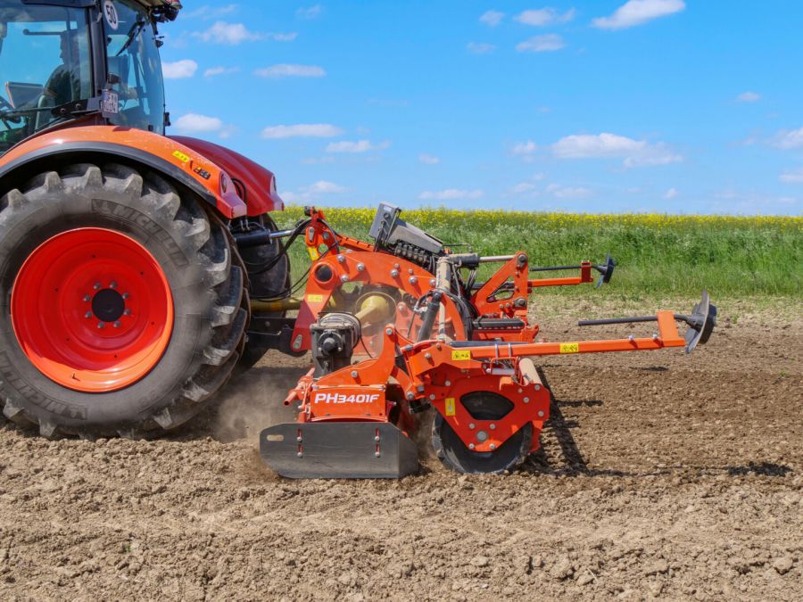 Die Saatbettbereitung mit der Kreiselegge PH3001F ermöglicht es dem Fahrer, die Arbeitstiefe entweder in der Basisversion über die Traktorhydraulik oder als ISOBUS-Variante über den Traktor ISOBUS bzw. das Kubota Tellus Pro/Tellus GO+ Terminal von der Kabine aus anzupassen. „Es liegt an der Erfahrung und dem Wissen des Landwirts, wo der Boden mehr oder weniger intensiv bearbeitet werden muss. Ein Knopfdruck am Terminal oder an der Traktorhydraulik und die Einstellung ist erledigt. Die Arbeitstiefe sollte immer auf das notwendige Minimum reduziert werden, denn ein Zentimeter Arbeitstiefe bedeutet ca. 140 Tonnen Bodenbewegung pro Hektar. Eine geringere Arbeitstiefe reduziert also auch die freigesetzte CO2-Menge“, erklärt Produktmanager Andreas Potthast. „Veränderte Bodenverhältnisse erfordern unterschiedliche Einstellungen des Anbaugerätes.