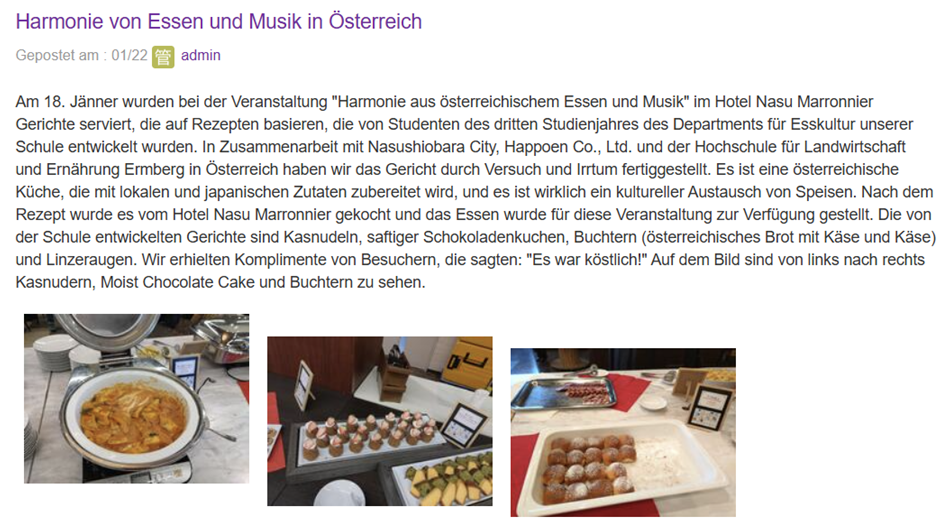Im Frühling 2024 nahm eine japanische High School aus Nasushiobara mit dem Schwerpunkt „Esskultur“ Kontakt zu unserer Schule auf, um eine spannende Kooperation zu starten. Das Ziel war es, österreichische Gerichte mit japanischen Zutaten nachzukochen und diese beim Frühlingsfest 2025 in Nasushiobara zu präsentieren. Dieses kulturelle Event wird von österreichischer Musik begleitet, und die kulinarischen Angebote sollen dazu harmonieren.