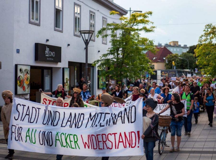 Im Rahmen der Demonstration wurde gratis Gemüse an die Teilnehmer:innen verteilt, das zuvor am sogenannten „Protestacker“ in Lichtenwörth geerntet wurde. Viele Freiwillige bewirtschaften dort aktuell ein Stück Ackerfläche, das durch den Bau der Ostumfahrung versiegelt werden soll. „Das Land befindet sich im Enteignungsprozess. Doch auch wenn die Enteignung der betroffenen Bauern durchgezogen wird, wollen wir nicht abziehen. Wir zeigen, dass dort statt einer Straße – auf diesem wunderbaren, besten Erdboden – auch kleinstrukturierte Landwirtschaft entstehen kann“, sagten Felix & Flora bei der Städtetag-Demo.