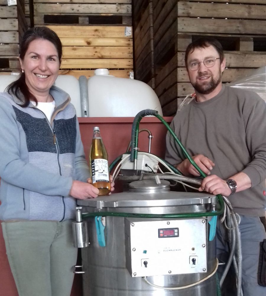 Obstbäume soweit das Auge reicht. Die Streuobstwiesen von Sigrid und Franz Allerstorfer sind die Grundlage für hunderttausende Liter Most. Daraus gärt der Apfelessig. „Unsere LABU-Essiganlage ist zwar schon etwas älter, aber alles funktioniert super. Jeder Handgriff sitzt.