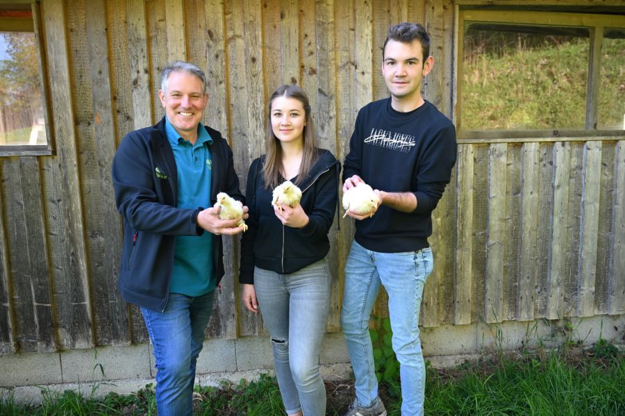 Die Schülerinnen und Schüler der Abschlussklasse der Fachrichtung „Landwirtschaft“ haben sich ganz der mobilen Hühnerhaltung verschrieben. Dreißig Weidehühner werden in Kürze auf den grünen Wiesen der Landwirtschaftlichen Fachschule (LFS) Warth für ein fröhliches Gurren und Gackern sorgen. Derzeit befinden sie sich noch im schützenden Stall, wo sie bei konstanter Temperatur aufwachsen.