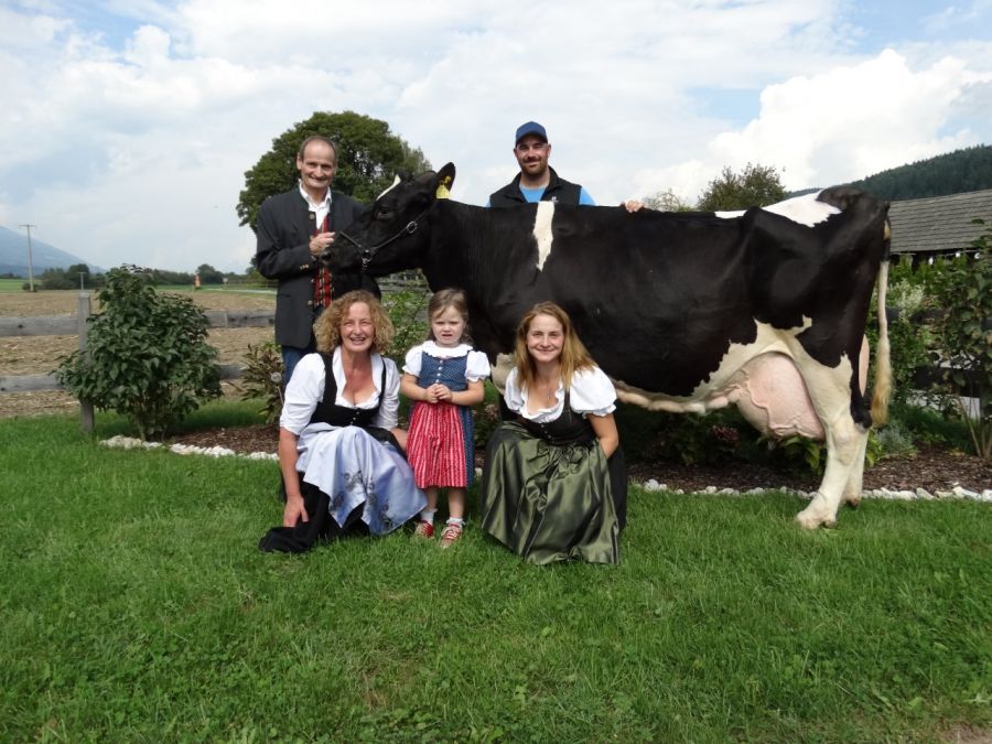 „Schon mein Opa war vor über 60 Jahren einer der Pioniere der Rasse Holstein in Kärnten und Gründungsmitglied des Kärntner Holsteinverbandes“, erzählt Melanie Kacic, die Tochter des Hauses. Mit dem Import der ersten Kalbinnen aus Deutschland stellte er von Pinzgauern auf Schwarzbunte um und entwickelte den Betrieb und die Herde ständig weiter. Seit 47 Jahren wurde kein fremdes Tier mehr zugekauft. Bei der Stierauswahl wurden die besten kanadischen und italienischen Vererber eingesetzt. So ist der Vater von Nelly der Italiener Mtoto, der die meisten 100.000-Liter-Kühe in Kärnten hervorgebracht hat. Der Stalldurchschnitt beträgt in den letzten zehn Jahren 12.686 Kilo Milch bei 3,73 % Fett und 3,31 % Eiweiß. ,,Somit zählt unsere Herde seit vielen Jahren zu den leistungsstärksten in Österreichs“, so die Jungbäuerin. Einige Jahre wurde sogar drei Mal am Tag gemolken. In diese Zeit fällt auch der Bestwert von Nelly, den sie in ihrer fünften Laktation erreichte.