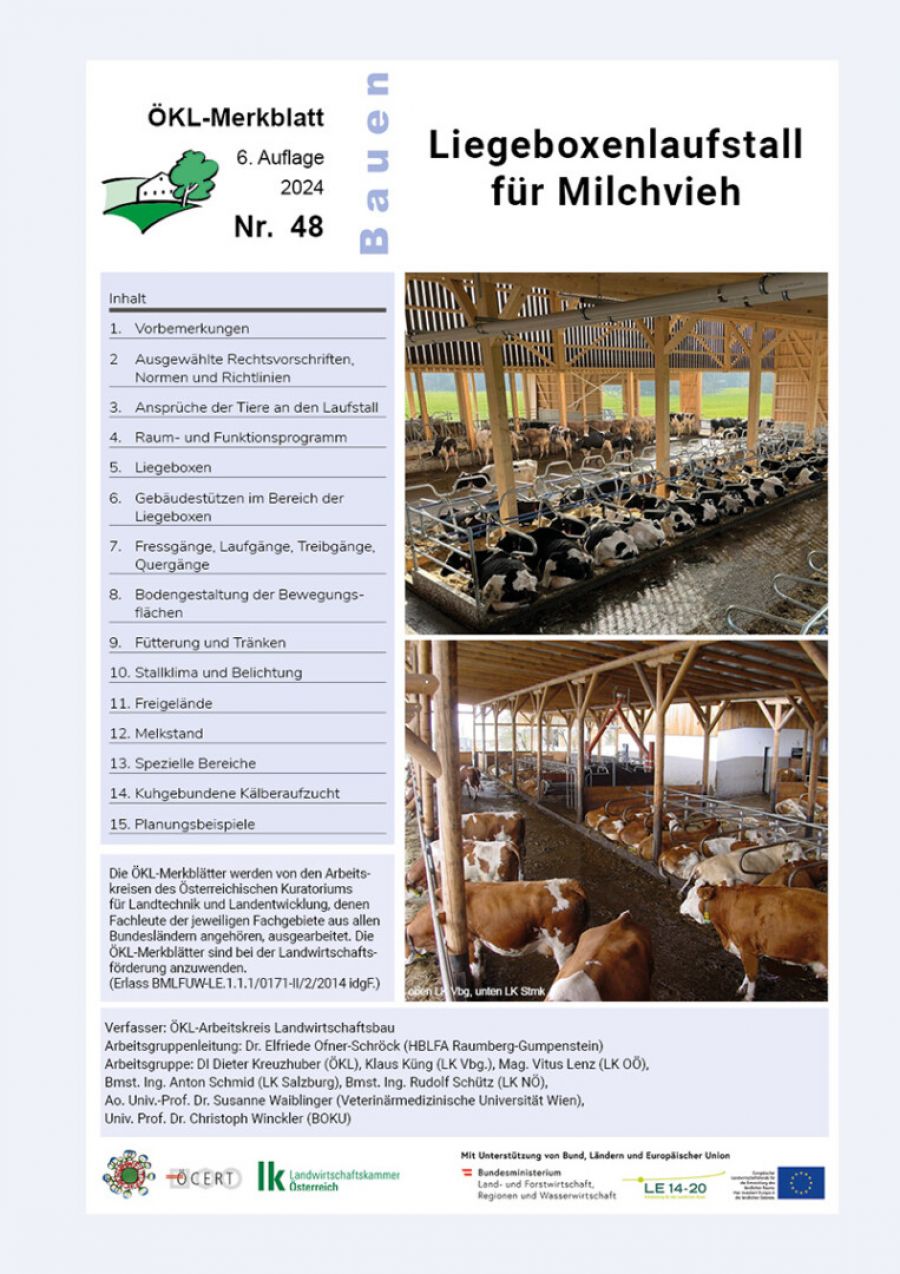 Das Merkblatt 48 Liegeboxenlaufstall für Milchvieh befasst sich mit dem Haltungssystem „Liegeboxenlaufstall“, das den Tieren freie Bewegung im Stall ermöglicht und mit Liegeboxen einzelne, voneinander abgegrenzte Ruheplätze bietet. So lassen sich eine tiergerechte Haltung, arbeitswirtschaftliche Vorteile und kostengünstiges Bauen miteinander verbinden. Ein Liegeboxenlaufstall ist für alle Betriebsgrößen möglich.