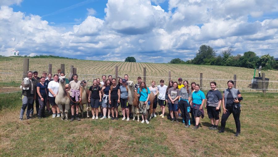 Zunächst wurden Verhalten, Biologie und Bedürfnisse der Tiere genau besprochen und auch anatomische Besonderheiten direkt am Lama vor Ort erklärt. Danach stand Schautraining auf dem Programm, bei dem Karl, Rudi und Bolero zeigten, dass gutes Training mit Lamas zwar nicht einfach, aber bei sachgerechter Umsetzung überaus sinnvoll für Einsätze im Bereich der tiergestützten Intervention und medizinische Zwecke ist. Im Anschluss durften die Schüler selbst einige Parcoursübungen mit den Lamas ausprobieren und konnten so in Kontakt mit diesen besonderen Tieren treten.