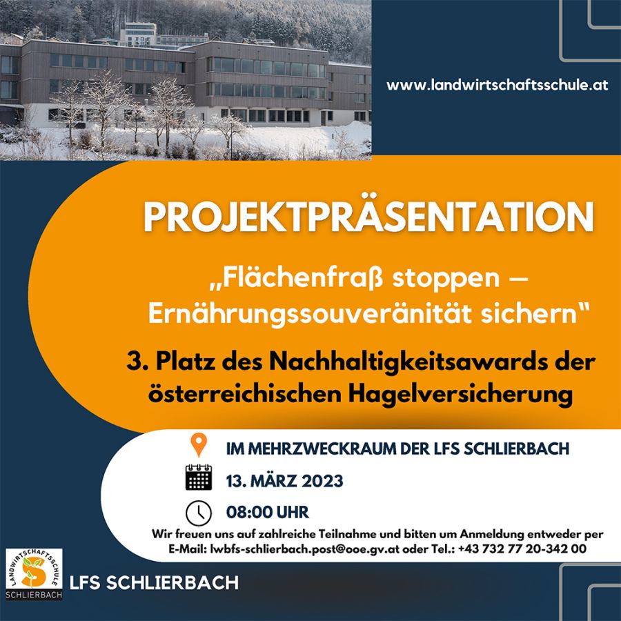 Die Schülerinnen und Schüler der 3. Klassen der Landwirtschaftsschule Schlierbach haben sich intensiv mit dem Thema Flächenfraß in Österreich beschäftigt und werden diese Ergebnisse, wie z.B. einen Problem- und Lösungskatalog und einen selbstgedrehten Kurzfilm am Montag, den 13. März 2023, um 8:00 Uhr, im Mehrzwecksaal der Schule präsentieren. Im Anschluss an die Präsentation wird in prominenter Runde eine Podiumsdiskussion geboten; alle Interessentinnen und Interessenten möchten wir ganz herzlich zu dieser Veranstaltung einladen! Das Projekt erreichte beim Nachhaltigkeitsaward der Hagelversicherung im Jahr 2022 den 3. Platz.