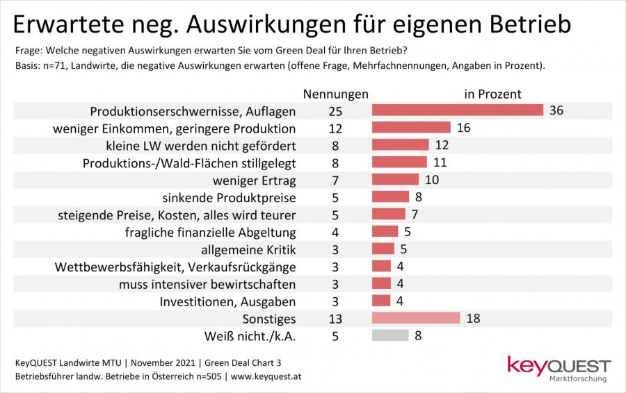 Das Wissen der österreichischen Landwirte über die Ziele des Green Deal für die Landwirtschaft ist aktuell noch sehr bescheiden, obwohl das EU-Programm vor mehr als zwei Jahren vorgestellt wurde und auch massive Auswirkungen auf Österreichs Landwirtschaft haben dürfte. Jene Landwirte, die sich bereits mit dem Green Deal beschäftigt haben, begegnen den EU-Plänen mit großer Skepsis. Befürchtet werden Einschränkungen bei der Produktion, sinkende landwirtschaftliche Einkommen und Wettbewerbsnachteile auf dem internationalen Markt. Zu diesem Ergebnis kommt eine aktuelle KeyQUEST Landwirte-Befragung unter 505 Betriebsführern in Österreich.