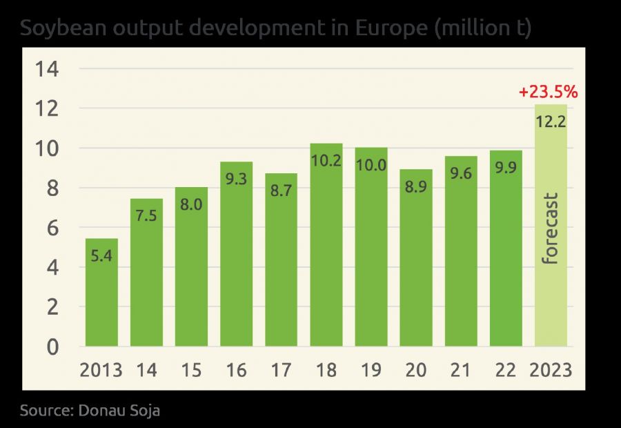 Grund für die massiven Erntesteigerungen waren der Flächenzuwachs in der Ukraine um 20 % sowie die günstige Witterung in der EU, die den Hektarertrag massiv erhöhten. Obwohl die Anbauflächen in Österreich (-6,4 %) und Deutschland (-12,8%) heuer zurück gingen, erhöhte sich die Ernte um 9,4 % bzw. um 9,6 % (Deutschland). Die Ernte beträgt heuer in Österreich 267.000 Tonnen und damit fast doppelt so viel wie in Deutschland. Für 2024 erwartet Donau Soja eine Ausdehnung der Anbauflächen im Jahr 2024.
