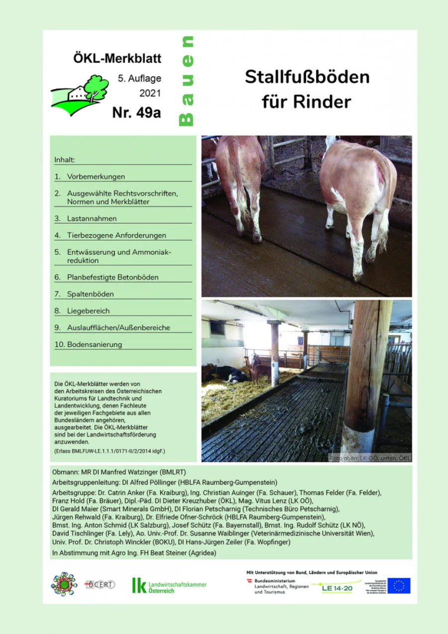 Das ÖKL-Merkblatt Nr. 49a „Stallfußböden für Rinder“ gibt wichtige Hinweise zu Lastannahmen für die Planung, Anforderungen an planbefestigte und perforierte Stallböden im Aktivitätsbereich, gibt Informationen zu Liegeflächen und Böden im Außenbereich. Weiters gibt das Merkblatt Hinweise zur Entwässerung und Ammoniakreduktion sowie zu unterschiedlichen Möglichkeiten zur Bodensanierung.