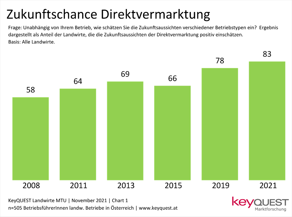 Als Experte für Agrarmarktforschung führt KeyQUEST Marktforschung seit 2008 regelmäßig Landwirte-Befragungen in Österreich durch. Dabei werden in mehrjährigem Abstand auch die Zukunftsaussichten verschiedener landwirtschaftlicher Betriebszweige erhoben. Speziell für die Direktvermarktung zeigt sich dabei ein kontinuierlicher Aufwärtstrend. So ist der Vergleichswert seit 2008 von 58% auf 78% im Jahr 2019 angestiegen. Corona samt Lockdowns haben schließlich dazu geführt, dass dieser Wert im Jahr 2021 auf einen Rekordwert von 83% geklettert ist (Abb.1). Damit führt die Direktvermarktung das Ranking der Betriebszweige als Zukunftsträchtigster an.