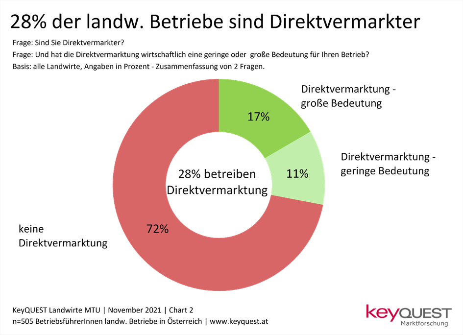 Direktvermarktung wird von immer mehr Landwirten als Betriebszweig mit den besten Zukunftsaussichten gesehen. Laut einer aktuellen KeyQUEST Umfrage unter 500 Betriebsführern landwirtschaftlicher Betriebe in Österreich beurteilen 83% die Zukunftsaussichten der Direktvermarktung sehr positiv bzw. eher positiv. Damit attestieren die Landwirte der Direktvermarktung die besten Zukunftschancen im Vergleich mit 10 anderen Betriebszweigen. Dies ist der höchste Wert, der seit der erstmaligen Messung im Jahr 2008 erreicht wurde. Gleichzeitig setzen aktuell mit 28% so viele Betriebe wie nie zuvor auf die Direktvermarktung ihrer Erzeugnisse.