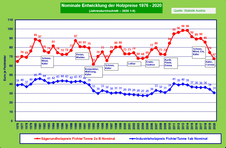 Ein Blick über die Grenzen Österreichs hinaus zeigt, dass unsere Nachbarländer Tschechien und Deutschland ihren Holzeinschlag in den letzten Jahren wegen der Borkenkäferschäden massiv erhöht haben (2008-2017: durchschnittlich rund 87 Mio. fm // 2019: 121 Mio. fm). Diese Steigerung der Holzernte bewirkt einen enormen Mengendruck auf dem Holzmarkt. Klimawandel und Kalamitäten verursachen Rekordholzmengen, die wiederum die Importe steigern und somit heimische Holzpreise unter Druck setzen.