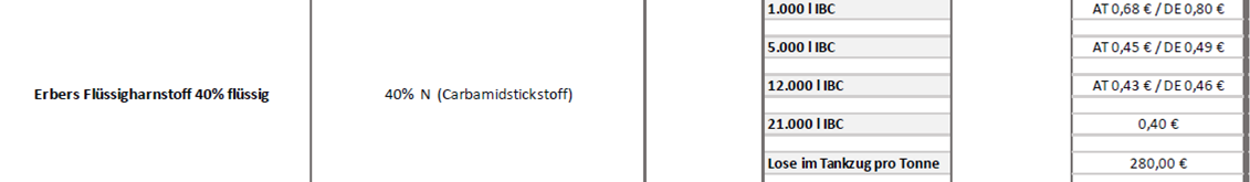 Preise netto / Liter im1000 IBC bzw. bei loser Lieferung im Tankwagen je Tonne frei Haus geliefert Österreich u. Deutschland