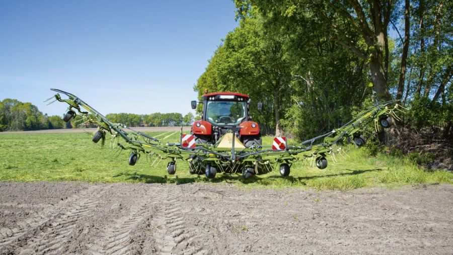 Ebenfalls neu ist das Kreiselkonzept: Durch die sehr nah am Zinken laufenden Kreiseltasträder (im Vergleich zum KW 20 cm näher) ist eine vorbildliche Bodenanpassung gewährleistet. Ebenso wie beim Highland Vendro setzt KRONE bei den neuen Wendern auf das KRONE OptiTurn-Kreiselkonzept. Aus der Kombination der eng am Zinken laufenden Kreiseltasträder mit dem neuen, patentierten KRONE OptiTurn-Zinken resultiert ein mustergültiges Arbeitsergebnis.