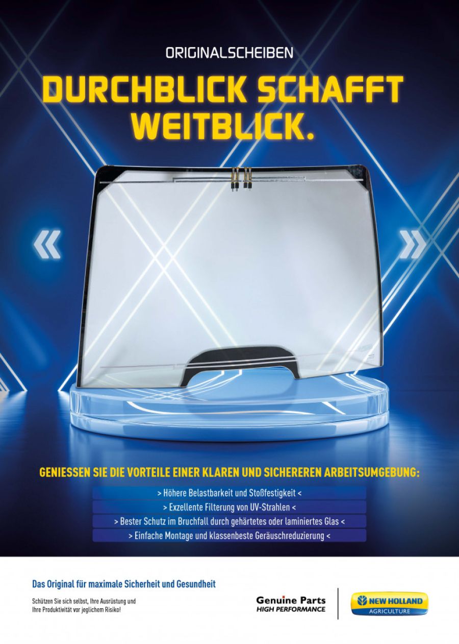 New Holland denkt bei jeder Entwicklung neben Performance und Profitabilität für den Kunden vor allem auch an die Sicherheit und Gesundheit der Fahrerinnen und Fahrer. Mit hochqualitativen Produkten und durchdachten Serviceleistungen wird die Marke auch bei einem Scheibenwechsel oder anstehendenden Wartungen zum Ansprechpartner erster Wahl, was die dritte Phase einer neuen Kampagne aufmerksamkeitsstark präsentiert.